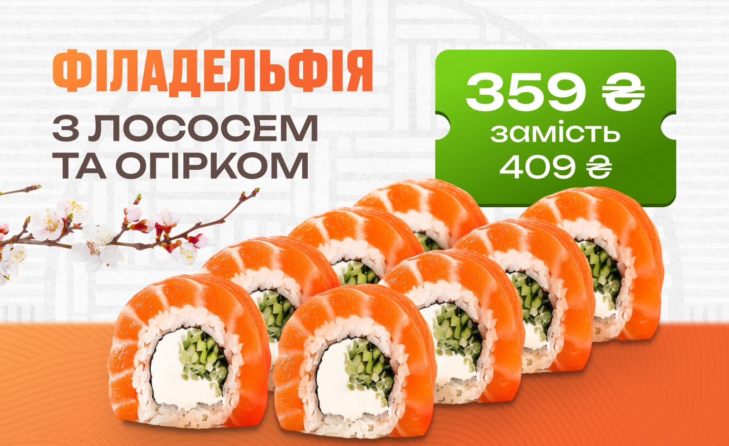 Знижки місяця! Увага - у одному замовленні можно скористатись одним промокодом, або коткоїнами.Знижка на Філадельфію з лососем та огіркомЗнижка -20% на Філу з лососем в кунжуті Головна Знижки місяця!