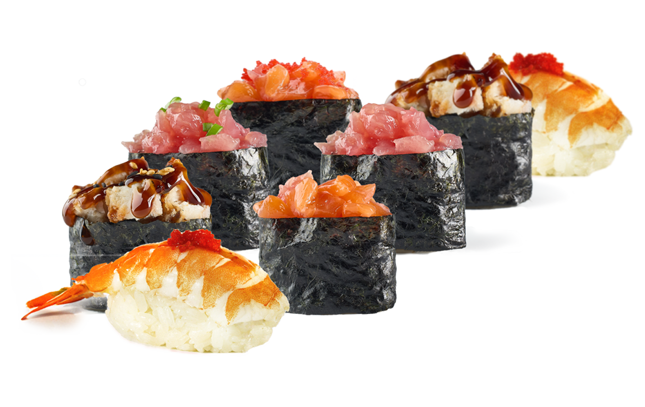Гункан "Спайсі" з вугрем, Гункан "Спайсі" з лососем, Гункан "Спайсі" з тунцем, Гункан з вугрем, Гункан з лососем, Гункан з тунцем, Суші з креветкою